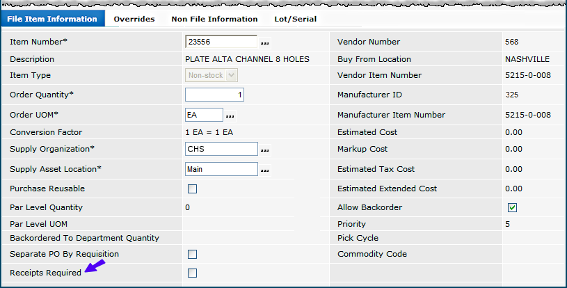 • "Bill-and-replace" lines may be used for non-stock items. These items are flagged as receipts required, and need to be replaced with the quantity that was consumed. The vendor invoices the items and replenishes them. They are received and issued back to the department that required them.