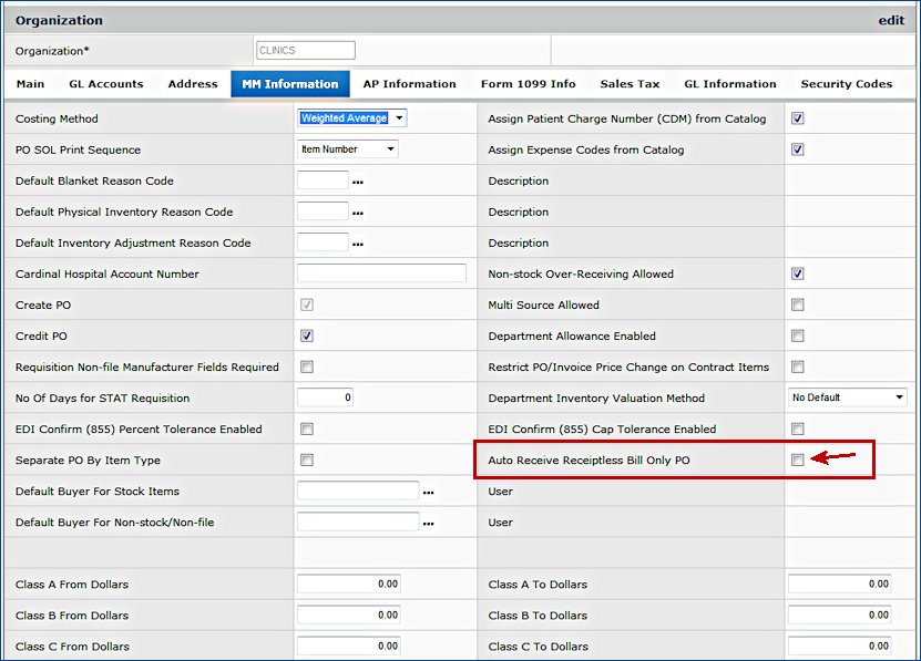 A new field on the Organization record implements the auto-receive feature (Figure 3). The field is Auto Receive Receiptless Bill Only PO.