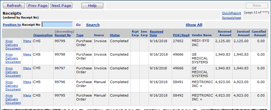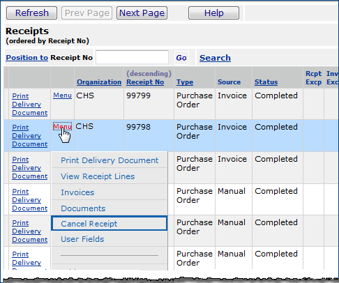 Materials Management performs receipt cancellation by receipt number. A receipt for a PO shows the quantity for one or more lines that have been received, the received dollar amount that has been matched with invoices, and the on-hand quantity. Cancellation can occur for the amount that has not been invoice matched, if the on-hand quantity is adequate.