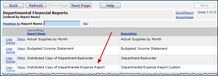 From Menu next to any report definition on the list, you can print a report, schedule a report to run, view reports that have run, edit the report definition, delete the report definition, and more. Clicking New lets you create a new report definition.