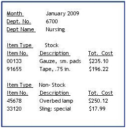 You want data by department, and by item type: stock or non-stock. Your report will have fields for the Month (selectable), Department Number, Department Name, Item Number, Item Description, Item Type, and probably the Total Cost to the department for each item. Your grouping fields are Department Number and Item Type. You want separate data for items of each type and each department. Your totaling field is Total Cost.