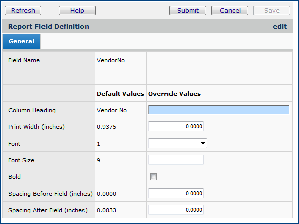 Under "This field will...", Vendor Name has the instruction "begin a new heading/totaling field." This instruction groups the data (that is, the PO cost totals) by vendor name. Vendor No prints with Vendor Name, so that Vendor No is no longer a separate column, but instead, is part of the group heading. Also, the column order has changed so that Vendor Name prints before Vendor No.