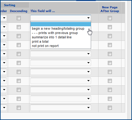 Selections shown in Figure 8 are:begin a new heading or totaling group - Select this value when your field is a grouping or classification field. In Figure 9, you would select this value for Department No and Item Type. A field with this value selected should not have a Sorting Order assigned. (See Creating Summary Reports.)