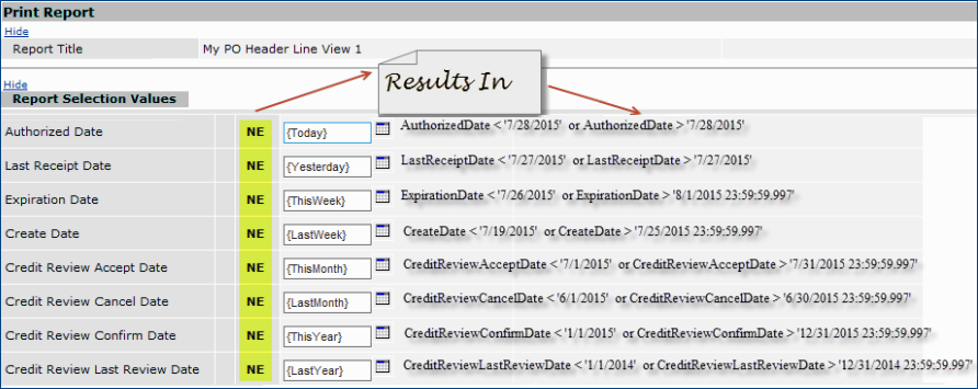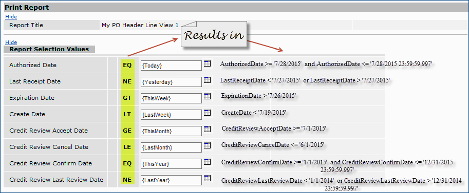 List - lists possible values.Figure 12A and Figure 12B display sample results for a date field when different operators, and NE are used.
