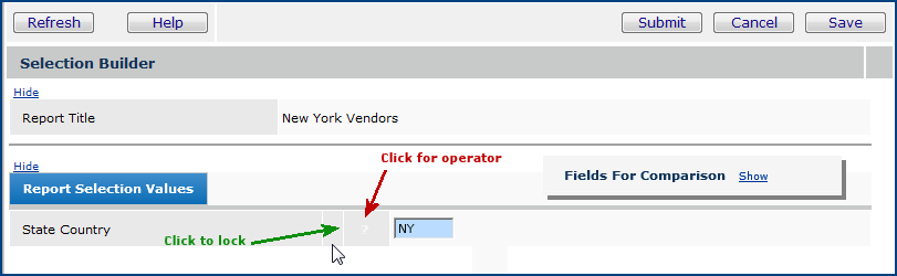 - If you wish to compare the field to another field, choose an operator, and click Show on the Fields for Comparison box. A list of selectable comparison fields appears.