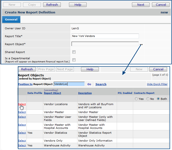 The role object “Reports” provides user access to the features in My Report Definitions and Standard Report Definitions. (Materials Management, AP, or GL main Contents > Reports)
