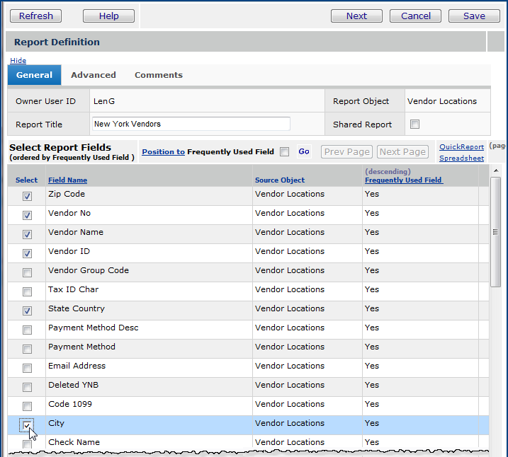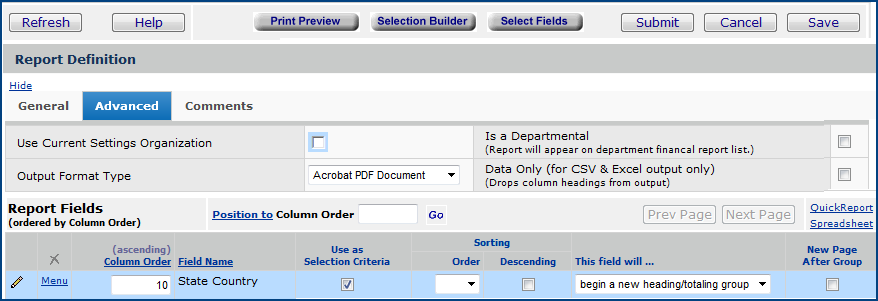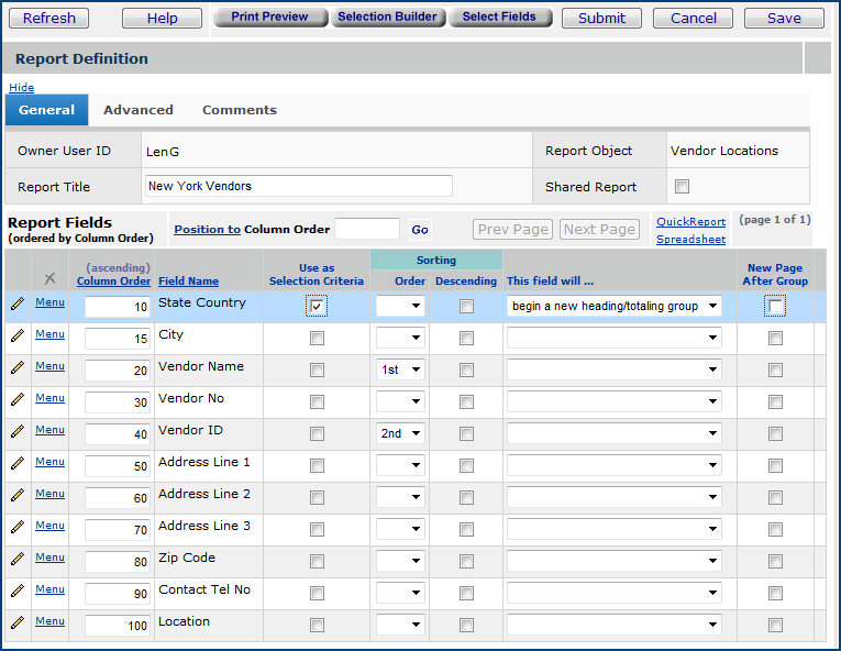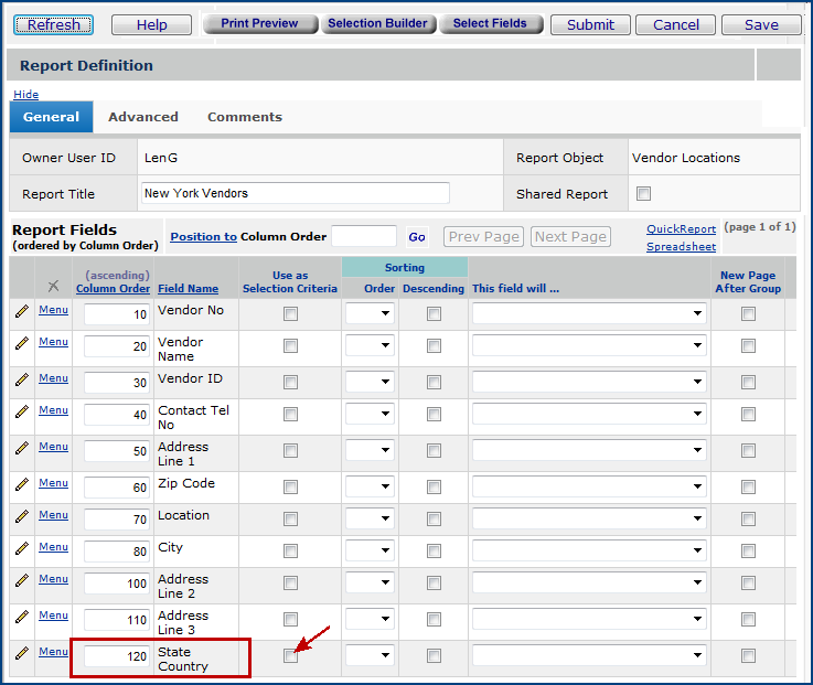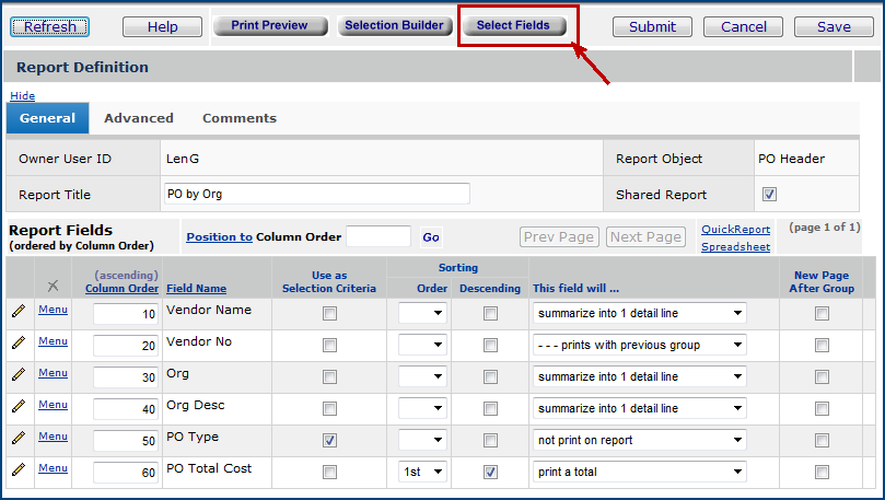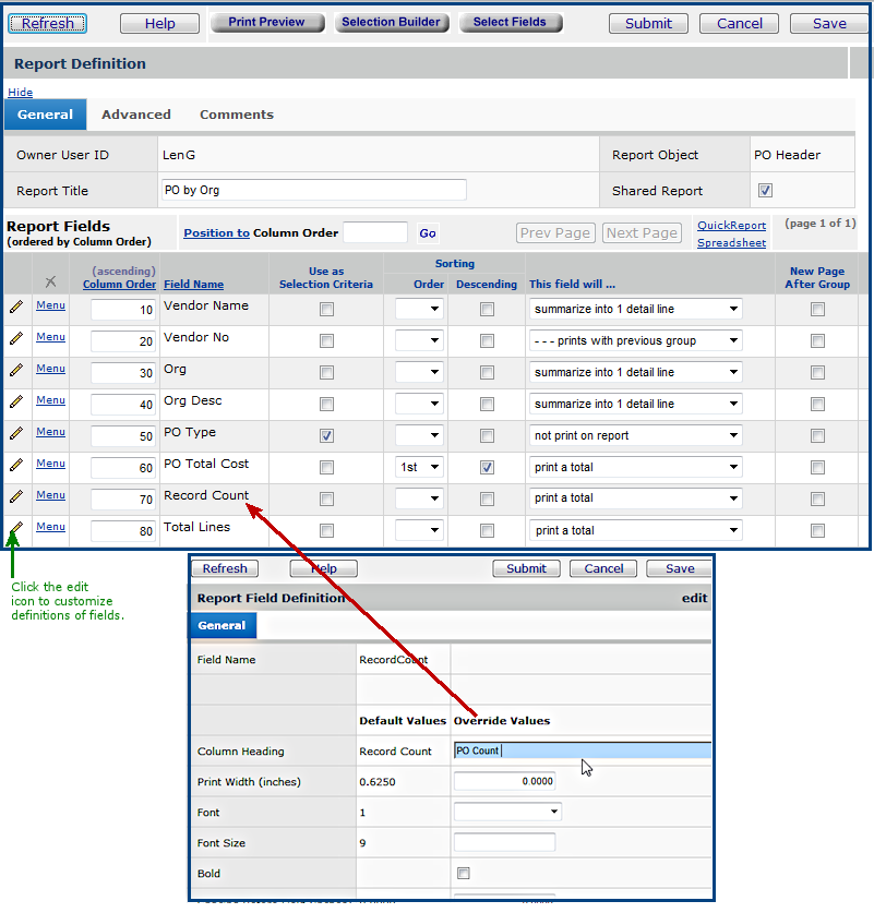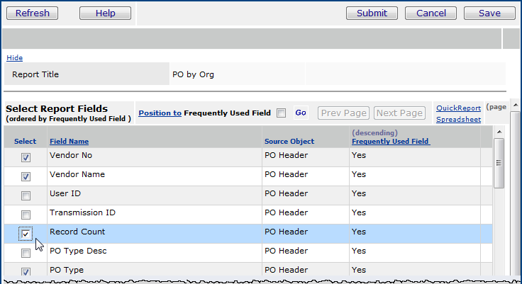 Scroll the list to locate and select Record Count and Total Lines. Click Save then Submit to return to the report definition. When you refresh the report definition (by clicking Refresh), the Record Count and Total Lines fields appear.
