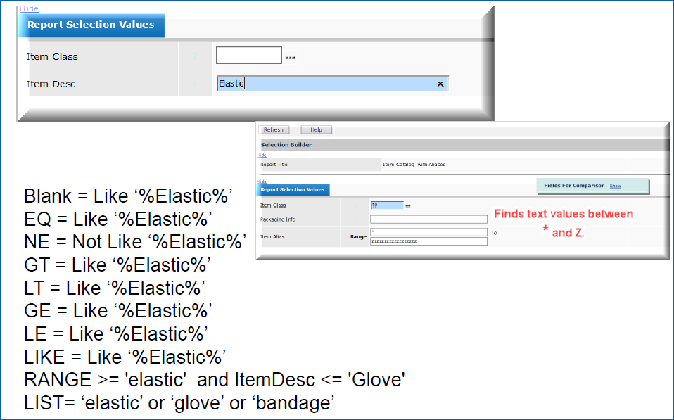 You can specify item description and item alias values in an Item Desc field using operators such as EQ, NE, etc.; Range and List. Figure 31 summarizes what the various operators mean when used with item description and item alias values. operators with text