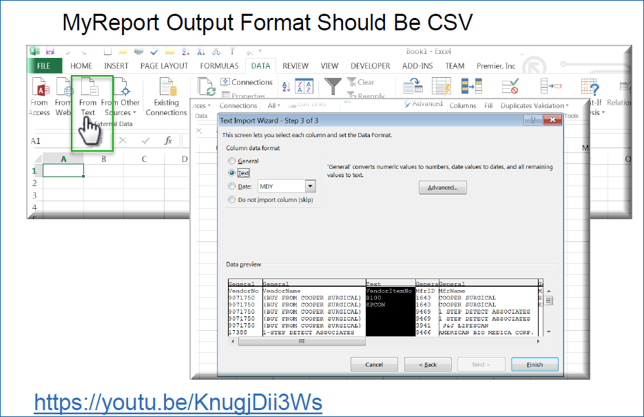 Excel provides a text conversion wizard (Figure 32). Also, in the figure is the location of a You Tube video that goes through the process.