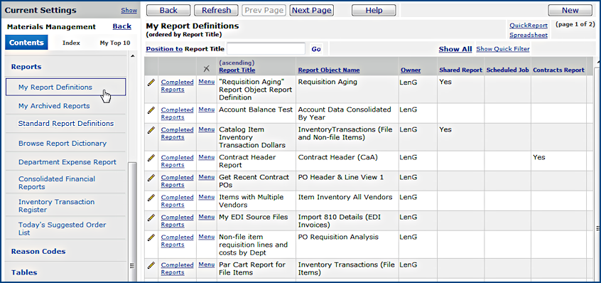 My Report Definitions. The list of custom reports appears (Figure 2), if any have been created by users at your site.