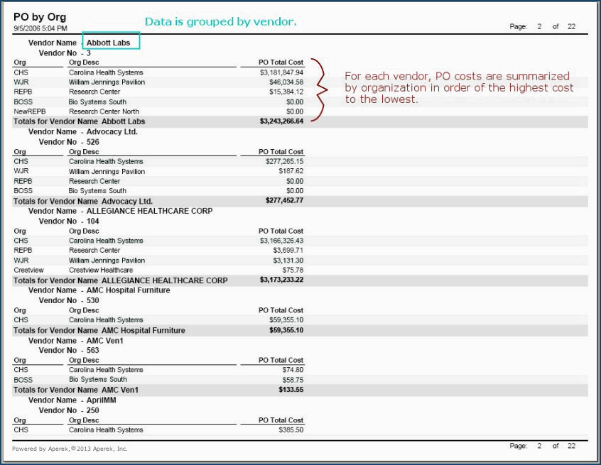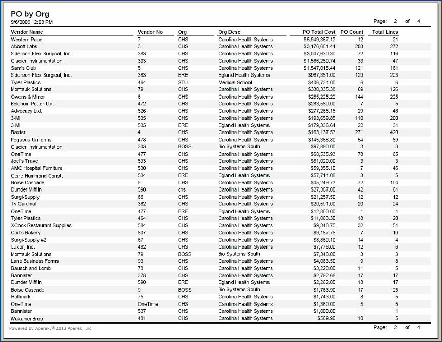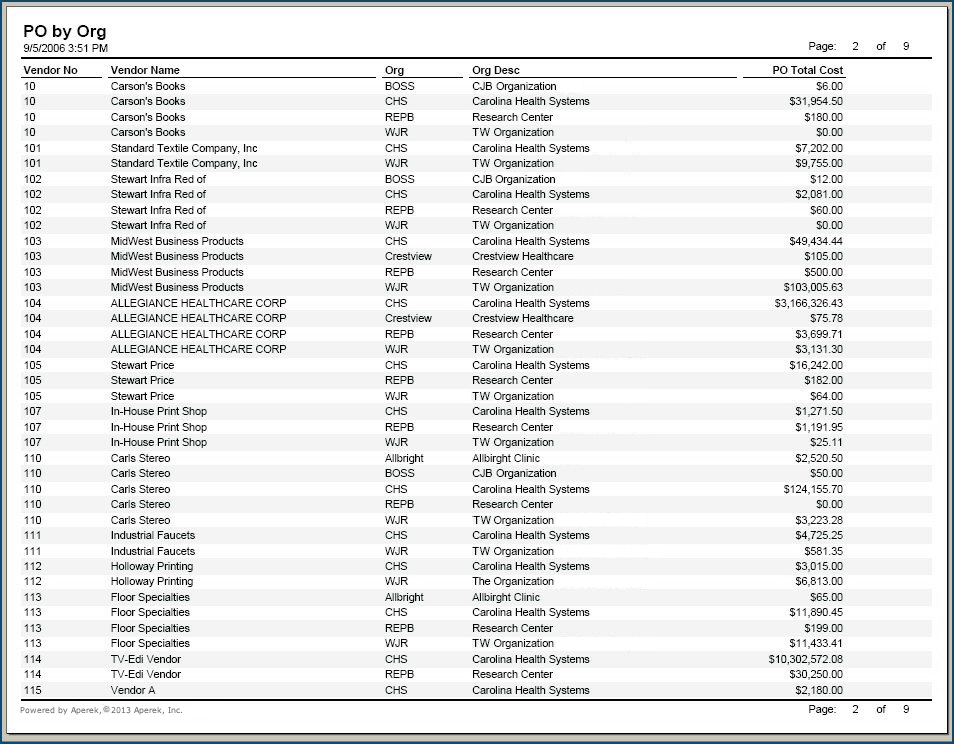 What we really need is a report that provides a summary, for each organization, of PO dollar totals and the number of POs by vendor.