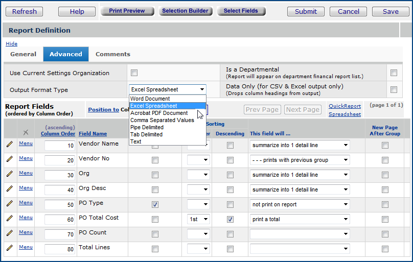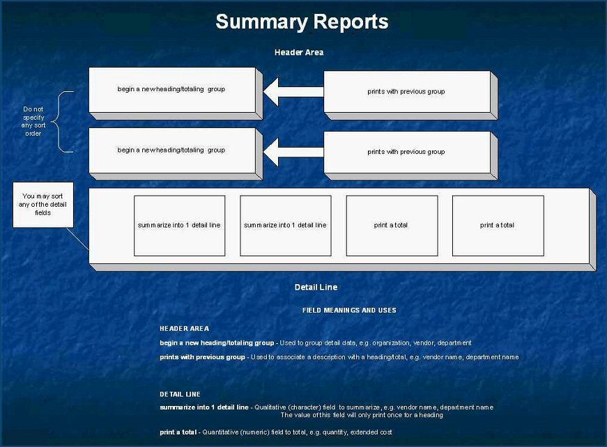 For each different value of the first four fields (Vendor No, Vendor Name, Org and Org Desc), a line is printed on the report that displays the PO Total Cost. In other words, the instructions ("summarize into 1 detail line") for the top four fields and for PO Total Cost ("print a total") collapse multiple purchase orders for each vendor and organization into a single purchase order total.