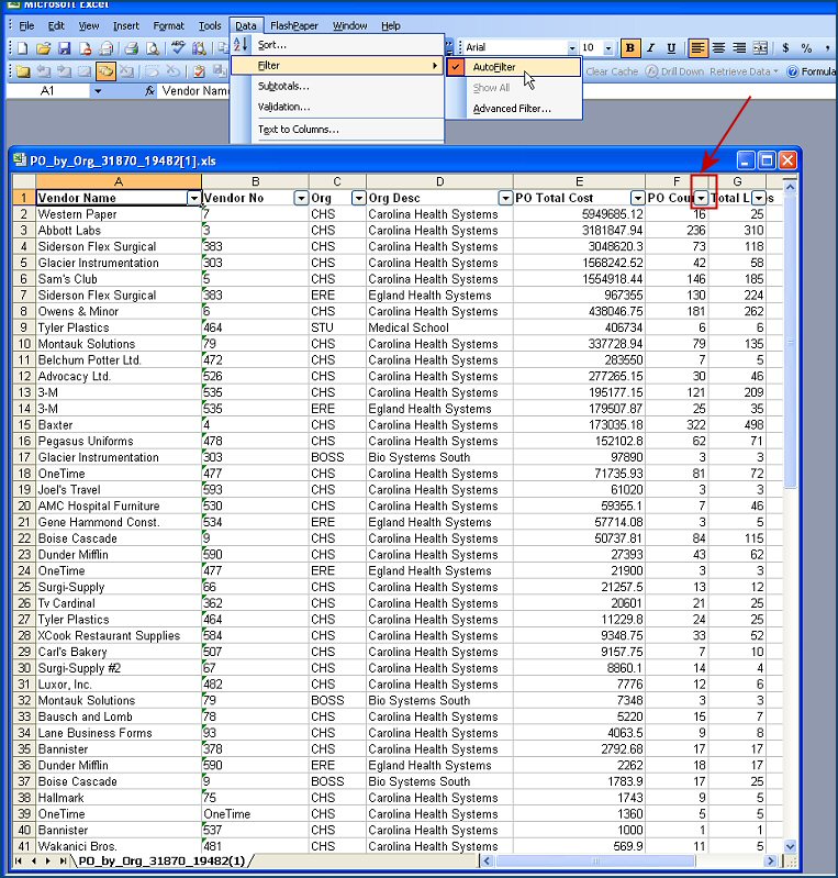 Notice that you can select the Excel AutoFilter capability from the Data menu. AutoFilter inserts a filter selection button