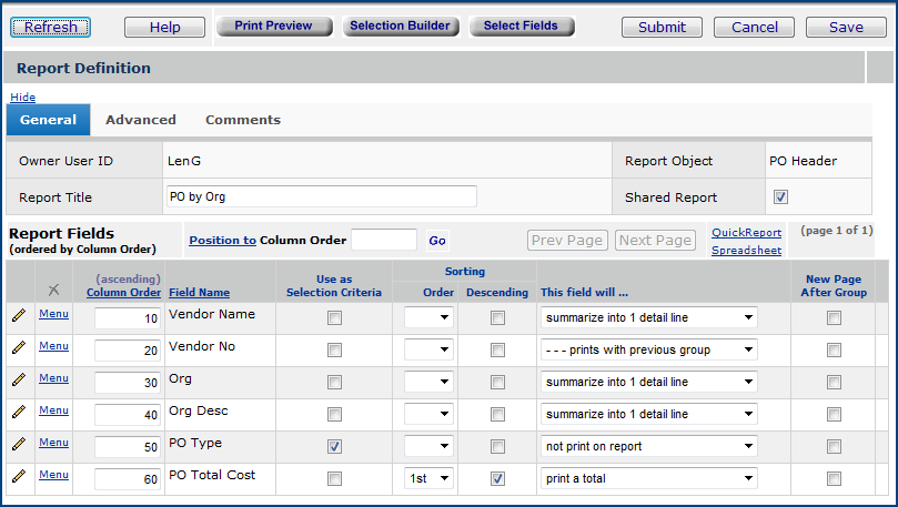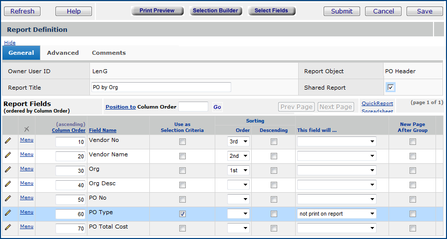 Figure 16 shows a report definition for a regular, detail report called "PO by Org." Notice that the columns are ordered by Org, then by Vendor Name and Vendor No. One field, PO Type, is a selection field that does not actually print on the report.