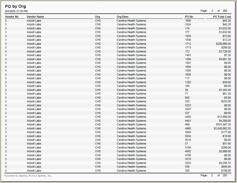 A page from the printed output for the report is in Figure 17. Notice that this output continues for 200 pages, with information about every PO for every vendor by organization. In its current form, this report is not very useful.