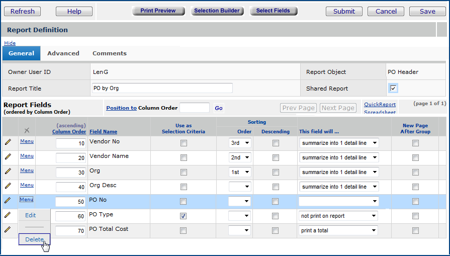 Notice that the field PO No is being deleted from the report definition. The PO No field is a text field that cannot be summarized or collapsed, since each purchase order has a unique PO Number. This field cannot contribute anything to the summary report (nor could the report run correctly if it is included), so it is deleted.