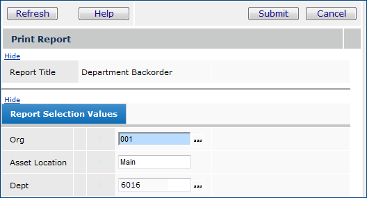 1. Verify that the Organization, Asset Location, and Department are correct for the report. If not, select new values.