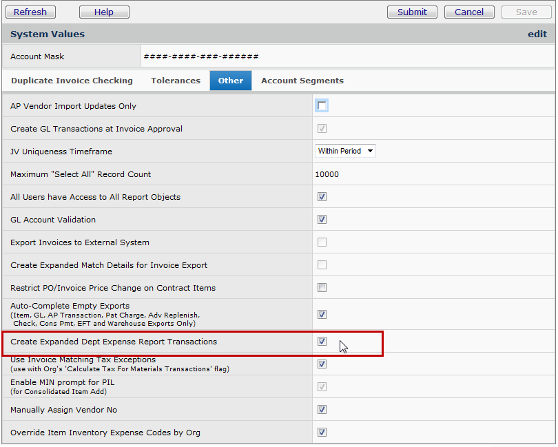 Figure 11 - System Values Flag for Expanding the Account Transactions Included in Department Expense Reports