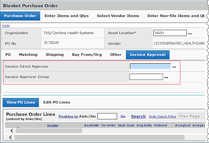 - On the EDI 810 invoice (if not assigned on either the PO or the blanket requisition). The ERP application then back-copies the approver/approver group to the PO and the requisition.