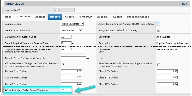 organization-level field controls the PO communication method and automatically sets it to Print when a Project Code is entered on a manual or system-generated PO. (No particular Project Code is needed. You can use any Project Code.)