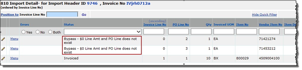 When an EDI 810 is imported and the Bypass field has been selected, the 810 detail line Status shows the new value Bypass - $0 Line Amt and PO Line Does Not Exist (Figure 54). The invoice is then matched, assuming that no other errors are present. The 810 header status is Invoiced.