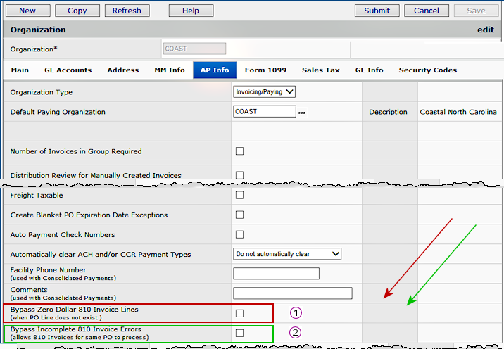 The Organization AP Info panel contains the new field Bypass Incomplete 810 Invoice Errors.