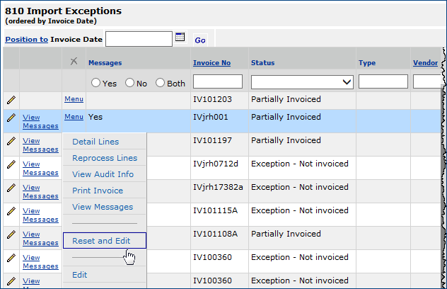 the View EDI Confirm Exceptions menu option is selected from the