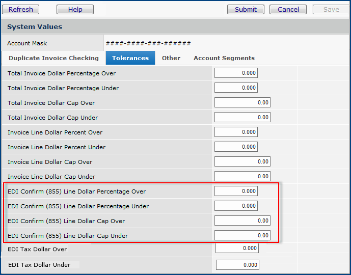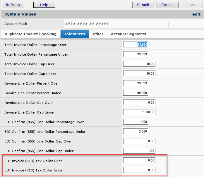 You define EDI tax tolerances in the application's System Values. Using EDI tax tolerances is optional, and can be set on or off via another field in System Values.