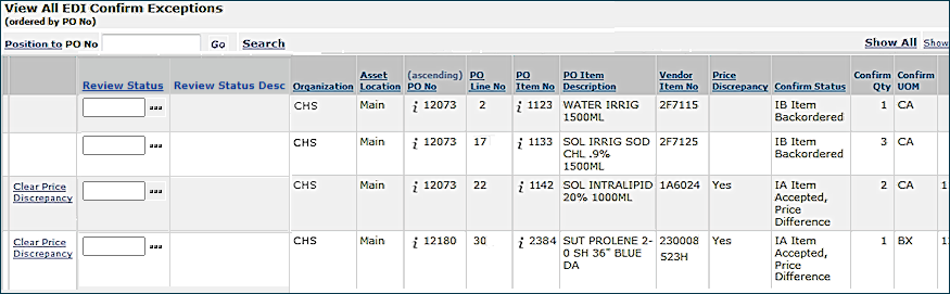 When a vendor confirms a purchase order in an EDI 855 document, the system imports the EDI 855 confirmation data, and updates the status of the PO. The application retains the data from the vendor, including any exceptions and makes the data available for your viewing. Exception information may refer to one or more lines on the PO, or all of the lines. You can review the information for individual lines, and for the PO as a whole. You can also open a list of all EDI PO confirmations with exceptions, and view individual confirmations from the list.