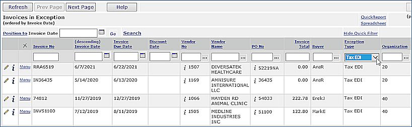 EDI invoices with an out-of-tolerance tax variance have the exception type TaxEDI. Invoices with this exception are incomplete and are displayed on the Invoices in Exception list (Materials Management or AP Main Contents > Invoicing > Exception Invoices) An example is in Figure 42. You will need to work with these invoices to complete them.