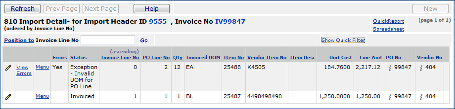 When the field is not selected, the 810 detail Status is Exception - PO Line Does Not Exist and the invoice is created as an exception (Figure 55). The 810 header status is Partially Invoiced and the invoice is created as Incomplete.