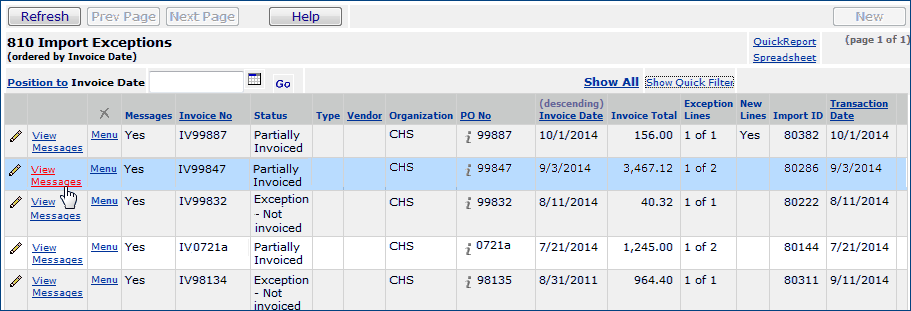 You can set a field on the organization record to allow incoming available EDI 810s to process when an incomplete 810 invoice exists for the same PO. This feature is useful when you have multiple EDI 810 invoices for a PO: one is incomplete, with exceptions, but others are available for matching.