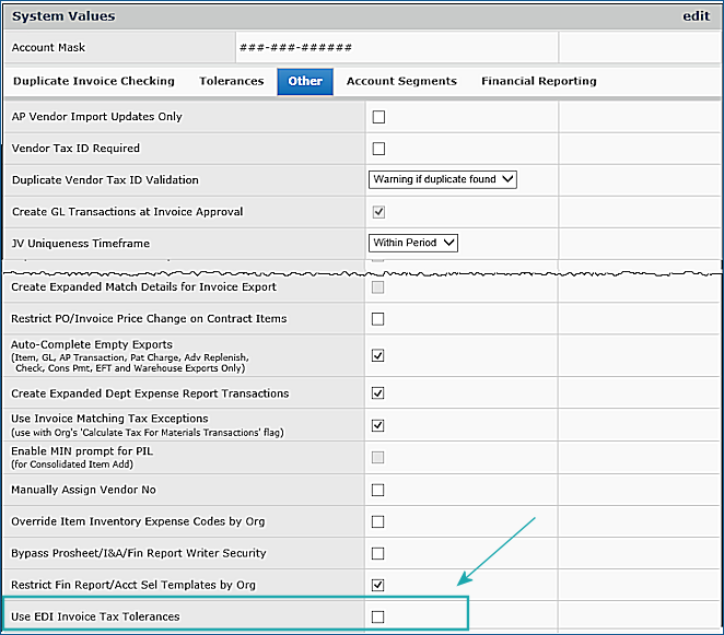 The field Use EDI Invoice Tax Tolerances on the System Values panel, Other tab (Figure 38) enables or disables the EDI invoice tax variance tolerance feature for your site.