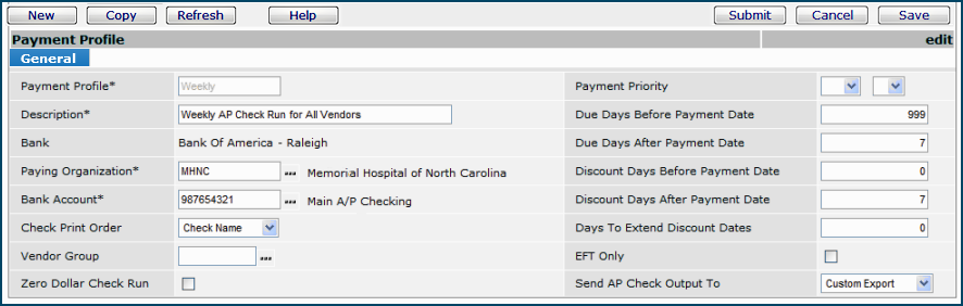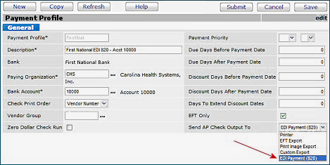 - On the Payment Profile Edit panel, for the field Send AP Check Output To, select: EDI Payment 820 (Figure 4A).