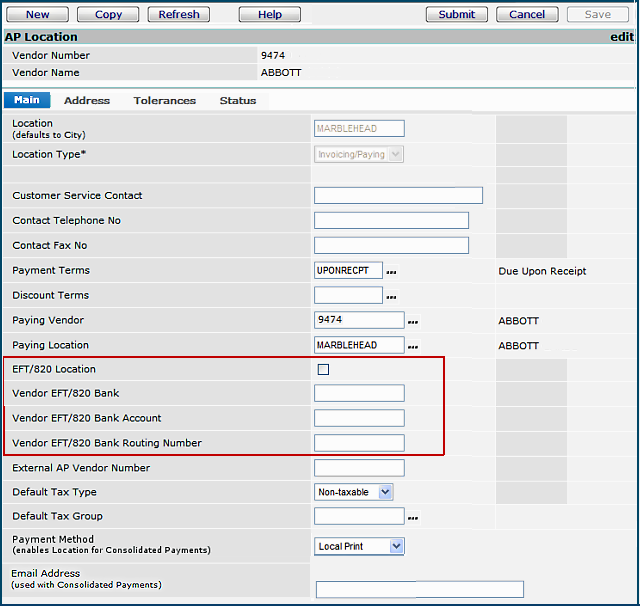 Note: Do not enter bank information for EDI 820 until the Help Desk has set up the bank. EDI 820 will not work.
