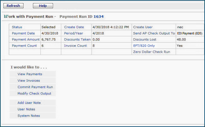 A payment run is built (Figure 6). The invoices selected for the payment run are only for EDI 820 vendors.