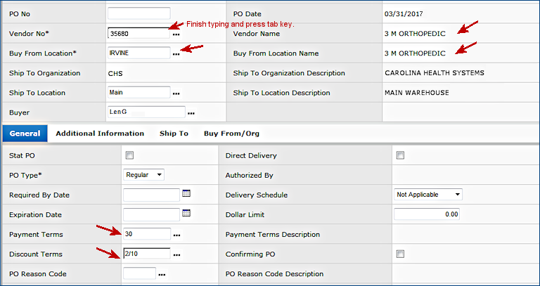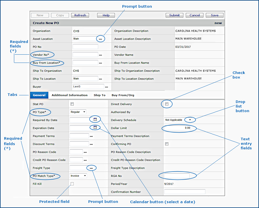 You use edit panels to do much of your work with the system. Edit panels, for example, allow you to create purchase orders and requisitions, create pick lists, enter and match invoices, create journal vouchers, create accounts, and many other activities. Edit panels contain fields -- areas where specific information is required. For example, the PO Number field specifies the purchase order number; the Required by Date field contains the date an order is needed, etc. Figure 1 is an example of an Edit panel that shows different kinds of fields.