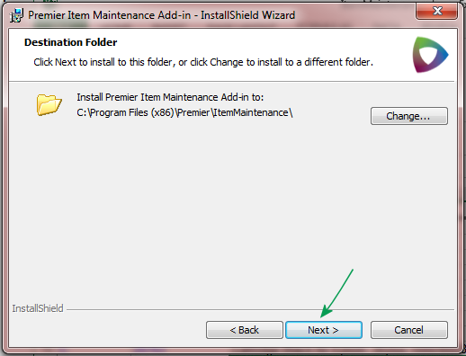 The Destination Folder panel specifies where the template and the add-in will be installed. If you wish to install the add-in at another location, click Change and specify the location.