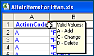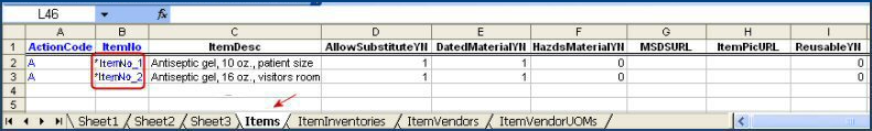 On the worksheet template, the ActionCode column tells Supply Chain what to do with each uploaded item record. The ActionCodes are: