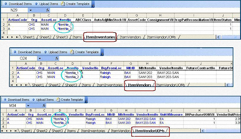 To import item data to Supply Chain, you enter item data in the rows of the worksheet templates. You can use Excel tools such as copy and paste to enter data. When you are finished making changes or entering new item records, you upload the worksheet(s) to Supply Chain, and Supply Chain imports the data.