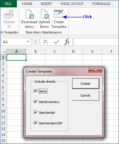 1. On the Excel worksheet (Figure 10), click Download Items, Upload Items, or Create Template.