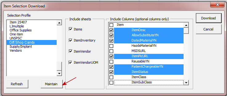 The Item Maintenance feature must be enabled before you can use either Item Imports or download the Excel Item Maintenance Add-In. (Both are available from the Materials Management main Contents.) To enable the Item Maintenance feature for your site, contact the Help Desk.