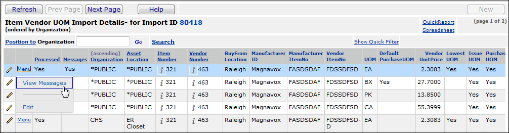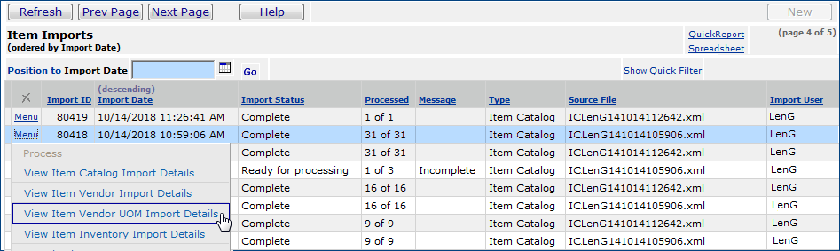 From the list of item import jobs (Materials Management Imports/Exports & Financials > Item Imports) , you can view the status of an import job, and any messages or errors.