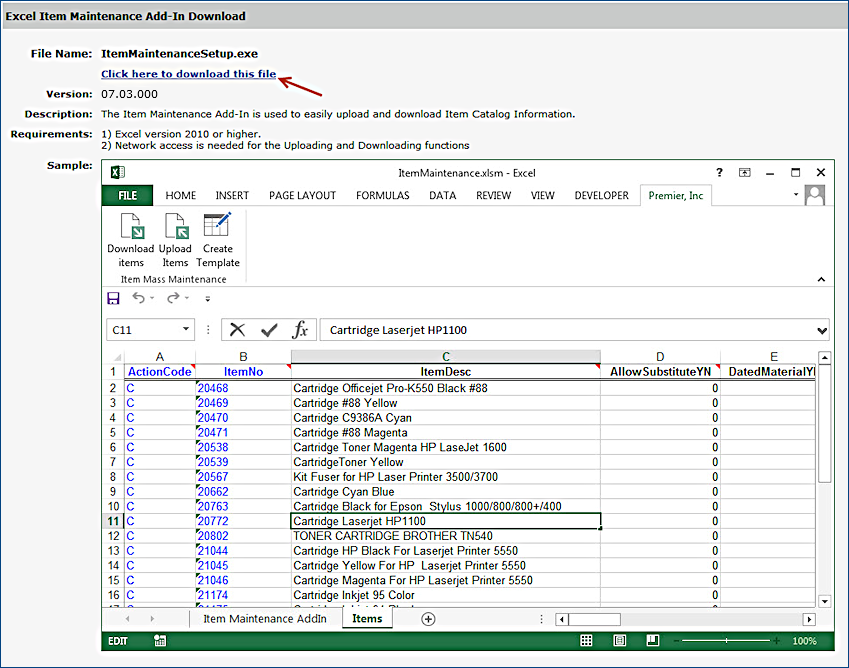 Figure 1 - Downloading the Excel Item Maintenance Add-in