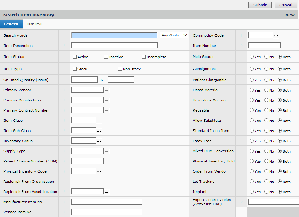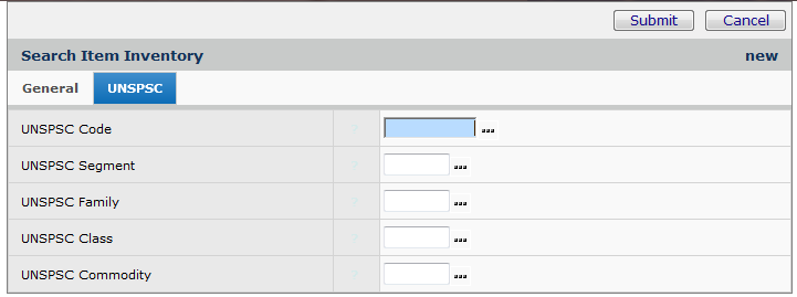 On the UNSPSC tab (Figure 1 and Figure 2) you can enter an entire UNSPSC Code, or one or more parts of the code, if your site uses UNSPSC codes to identify items. Figure 3 is the UNSPSC tab.