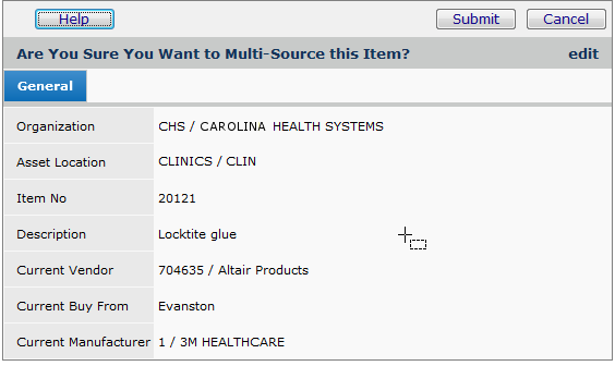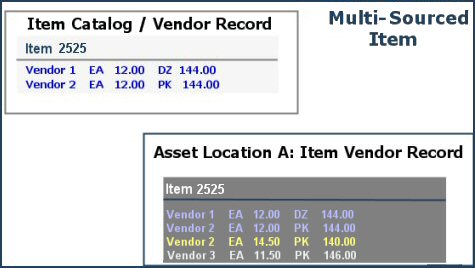 For this reason, multi-sourcing is more than just having multiple vendors for an item. Any item may have multiple vendors, and the vendor records in the Item Catalog may be available to every asset location that inventories the item. However, for a multi-sourced item, at least one asset location has a vendor record that is different from all item catalog vendor records for the item.