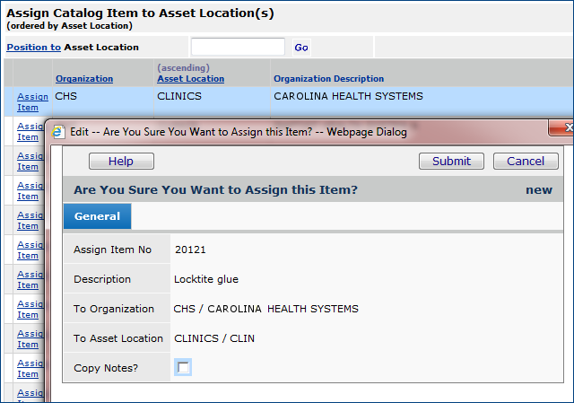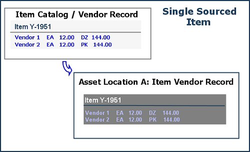 For a single-sourced item, the Item Catalog vendor records are used by the default asset location and by any other asset location that the item is assigned to; for example, Asset Location A (Figure 1).