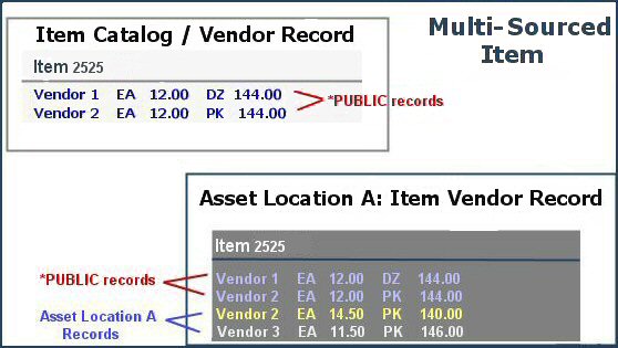 - For a single-sourced item, asset locations use the *PUBLIC item vendor records exclusively. Thus, vendor information is the same for all the asset locations that inventory a single-sourced item.