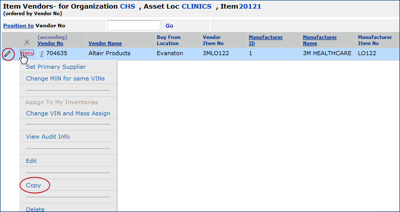 Figure 8 displays the item vendor record for the Clinics asset location after the item was set to multi-source. Notice that the Figure 8 record can be edited, copied (and changed) to create a new record. For example, Figure 9 displays a second, unique item vendor record for Clinics. A unique item vendor record is possible because the item is multi-sourced.