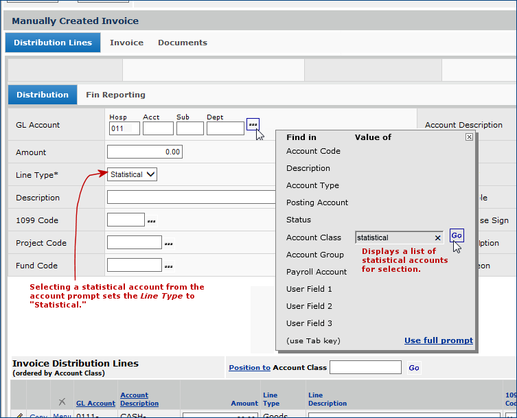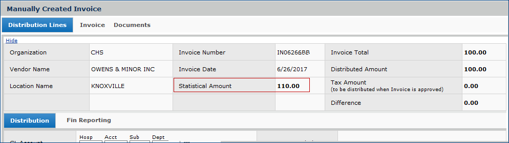 You can enter statistical GL account information on an invoice from the Distribution tab, just as you enter financial accounts for goods or charges. Statistical accounts can also be entered on Check Request detail lines. (See the Check Request topic.) Invoices with statistical account distribution lines can be imported. (See Import Invoices into Financials.)